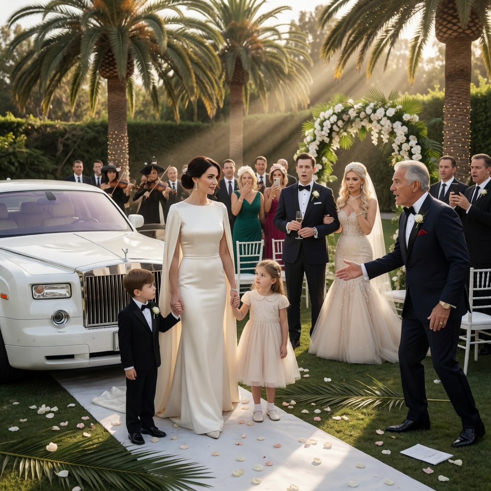 The invitation arrived on a Tuesday morning, thick cardstock, embossed gold lettering, the kind of detail Daniel Pierce always cared about more than people. I stared at it longer than I expected to. Daniel Pierce and Savannah Cole. Billionaire heiress. Of course he had upgraded. Three years ago, he had walked out of our marriage like he was stepping into a better life, leaving me behind with silence, rumors, and a reputation I didn’t bother correcting. Back then, I didn’t fight him. I let him believe whatever made him feel powerful. That I was lost. That I was struggling. That I couldn’t survive without him. “Mom, what is it?” my son Noah asked, climbing onto the couch beside me, his twin sister Ava following right behind him. I folded the invitation slowly. “An event,” I said calmly. “One we might attend.” Daniel’s message came later, short and deliberate. “It would mean a lot if you came. Closure matters.” I almost laughed. He didn’t want closure. He wanted confirmation. Confirmation that I was still the version of me he had left behind. That I would walk into that wedding smaller, quieter, defeated. Three years ago, I might have given him that. But not anymore. The day of the wedding, the estate looked exactly how I imagined—perfect, curated, expensive in a way that felt intentional. Palm trees lined the driveway, sunlight reflecting off polished surfaces and carefully arranged elegance. I sat in the back of the car, adjusting my sleeve while Noah and Ava leaned close on either side of me. “Are we late?” Ava asked softly. “No,” I replied. “We’re exactly on time.” The car slowed, gravel crunching beneath us as we approached the entrance. Conversations began to quiet, attention shifting toward the unexpected presence arriving at the gate. Then the car stopped. The driver stepped out and opened the door. The white Rolls-Royce gleamed under the sun. For a brief moment, I stayed still—not from hesitation, but from clarity. I understood this moment. Not as revenge. Not as proof. But as something final. I stepped out first, steady, composed, then turned to help my children. Their small hands found mine naturally, grounding me in a way nothing else ever could. We walked forward together. Conversations softened. Eyes followed. And then I saw him. Daniel stood near the ceremony aisle, his posture relaxed—until it wasn’t. The moment he saw me, everything in his expression shifted. The confidence faded. The certainty cracked. His smile froze, like reality had just rewritten itself in front of him. Beside him, Savannah turned, her curiosity quickly replaced by confusion. I kept walking, calm, unhurried, unaffected. And then something happened he never expected. A man stepped forward from the crowd, his presence commanding immediate attention. Charles Cole—Savannah’s father. Billionaire. Untouchable. He didn’t look at Daniel. Not even once. He walked directly toward me. “Elena,” he said, his voice warm, familiar. “You finally made it.” Daniel went completely pale. And in that moment, I realized something simple. He hadn’t invited me to witness his life. He had invited me to reveal it.